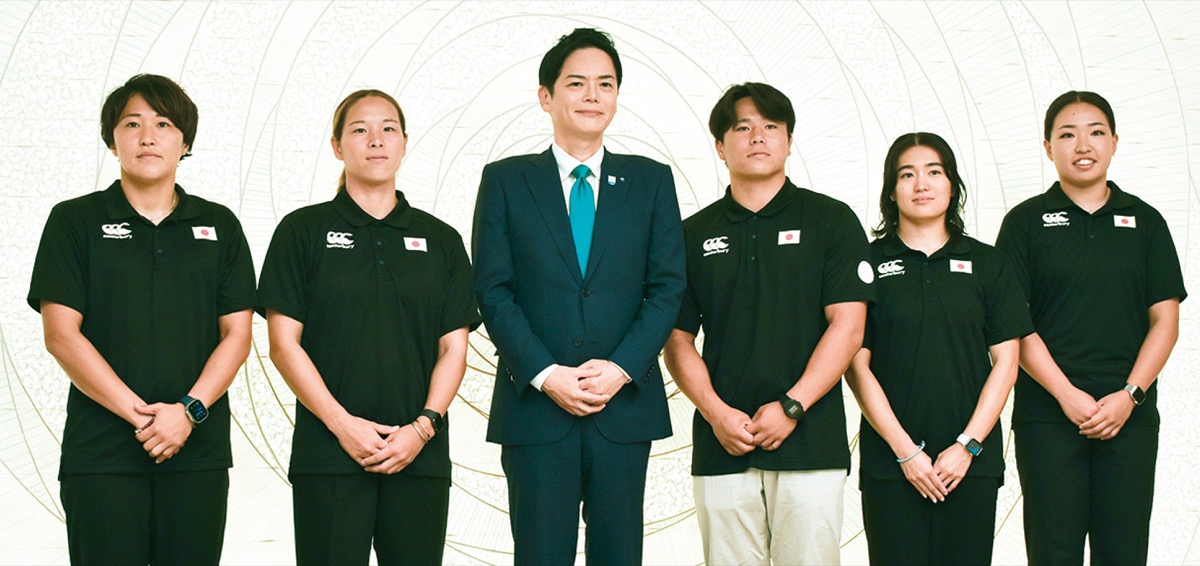 パリ五輪の7人制ラグビー日本代表に選ばれた、横浜市にゆかりがある5選手が7月9日に横浜市役所を訪問。山中竹春横浜市長らに代表内定を報告した。