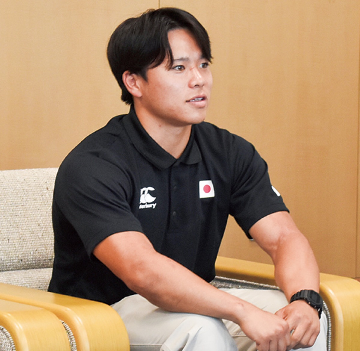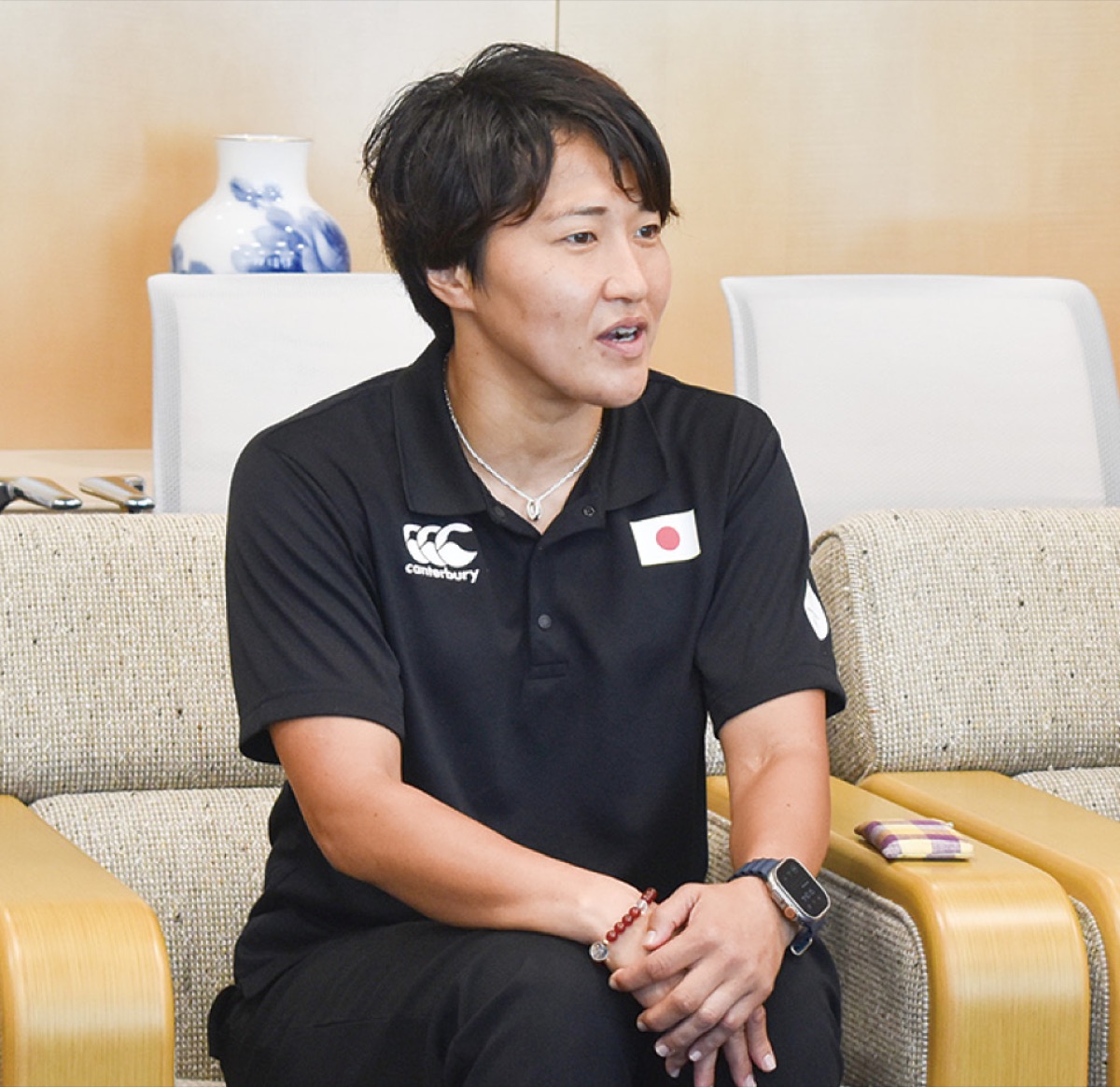 この日訪れたのは、男子代表は主将の石田吉平選手(横浜キヤノンイーグルス)、女子代表は戸塚区内で活動する内海春菜子選手(YOKOHAMA TKM)、青葉区が練習拠点の堤ほの花選手(日本体育大学ラグビー部女子)、神奈川総合高校=神奈川区=出身の中村知春選手、関東学院六浦高校=金沢区=出身の西亜利沙選手の計5人。
