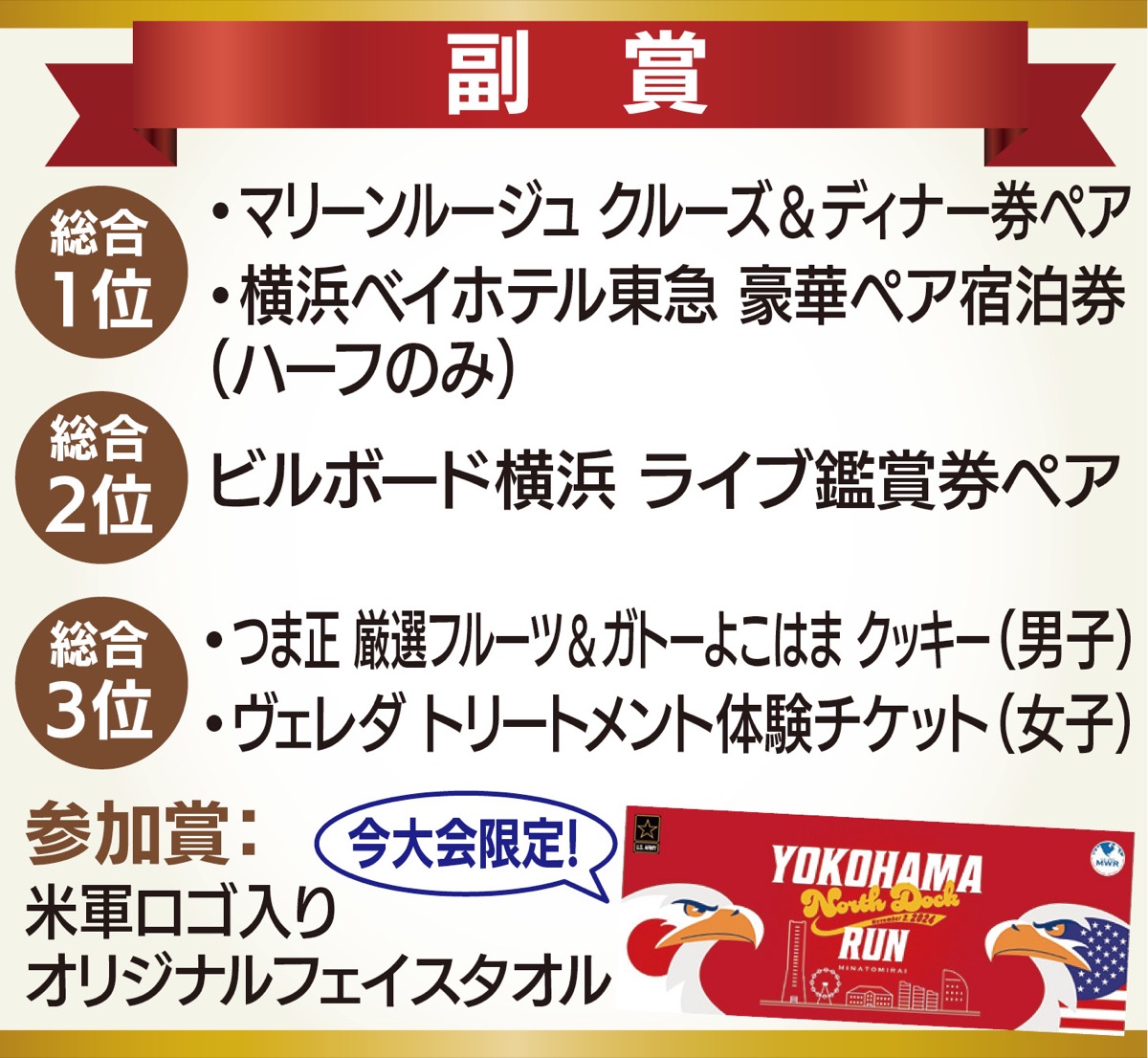 米軍の協力で、参加賞として米軍ロゴ入りのオリジナルフェイスタオルも。グッズ販売はないので、大会参加者のみが得られる”勲章”として手に入れたい1品だ。さらに今年は、ホテル宿泊券やクルーズ&ディナー券など、豪華副賞も揃う。