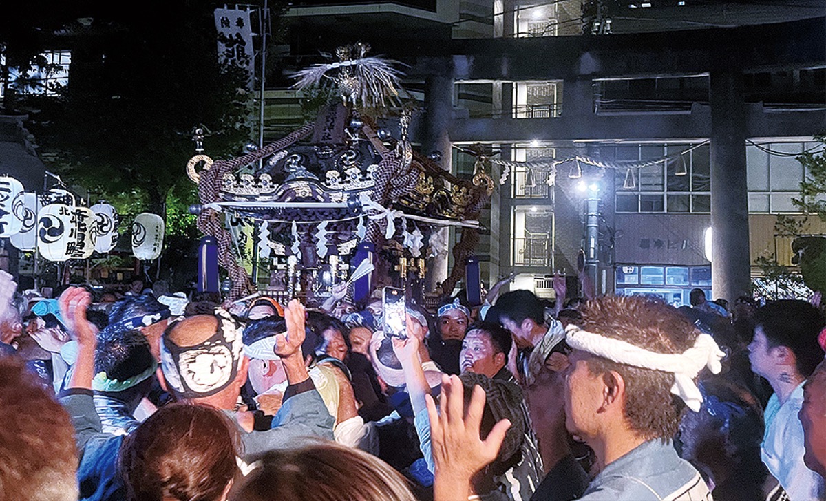 境内の舞台では横浜市の無形文化財にも指定されている土師流里神楽横越社中の神楽の奉納のほか、地元の児童によるヒップホップダンスも披露された。18日の夜には神輿の宮入を実施=写真。多くの地域住民が来場した境内には大きな掛け声と手拍子が鳴り響き、熱狂に包まれた。
