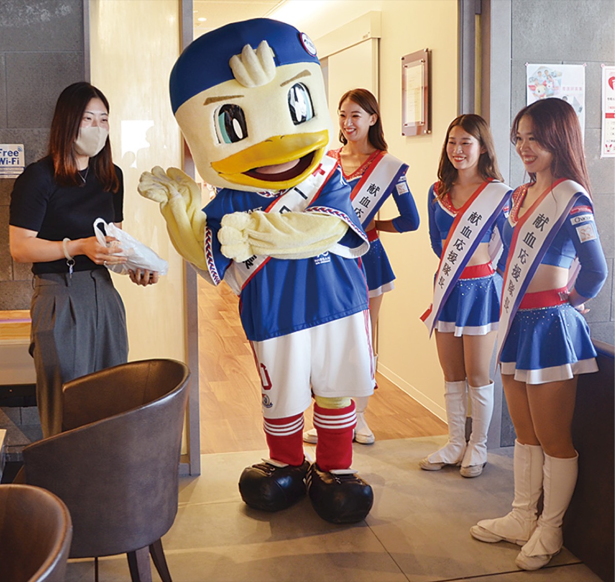 8月21日の「献血の日」に、サッカーJ1の横浜F・マリノスの公式キャラクター「マリノスケ」が横浜SKY献血ルーム=西区=の1日ルーム長に就任した。献血を受けた人へ水分補給のペットボトルや記念品を贈呈し、県の献血広報大使としてPR活動を行った。