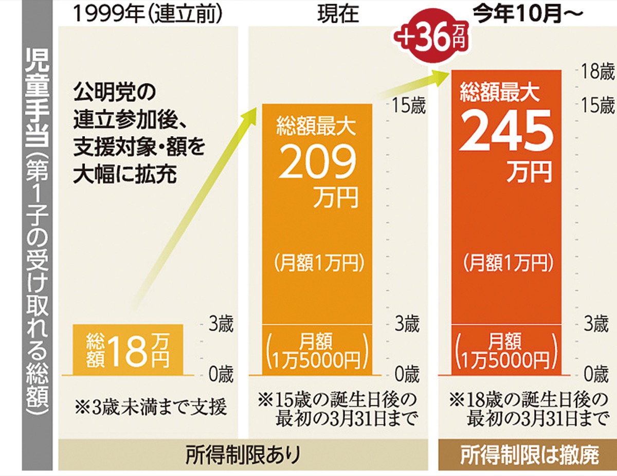続いて都議会公明党も「国に先駆けて都独自で実施せよ!」と訴え、69年12月に都の児童手当制度が成立しました。国会でも、68年に公明党が先駆者となり法案を提出。反対の声を乗り越え、72年1月に国の制度として児童手当が実現しました。その後も政府は繰り返し児童手当の縮小や廃止を試みましたが、その都度、公明党は手当の存続と拡充を訴え、制度を守り育ててきました。99年の連立政権参画にあたっても、政権与党の子育て支援策の柱として「児童手当の拡充」が明記されました。そして今年10月分の支給から抜本拡充が始まります。