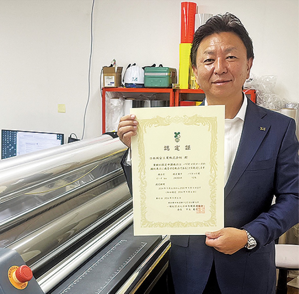 業界に先駆け、植物由来の素材を使用したバイオマスマーク取得の看板用フィルム「ビーオ」を自社ブランド商品として販売。自社製作の看板にも使用し、焼却時のCO2削減に貢献。「看板づくりを通して脱炭素社会に貢献したい」と小山社長は話す。(問)【電話】045・432・1390
