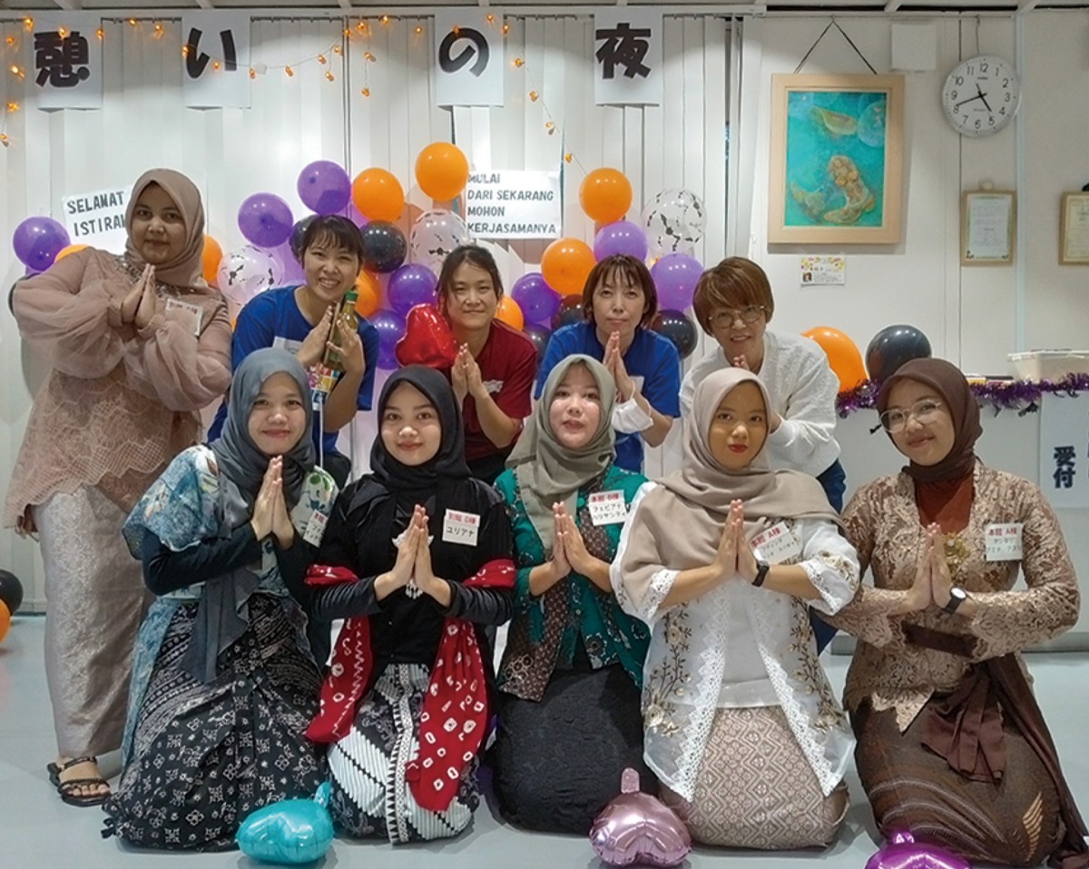 これは、同施設で活動するインドネシア出身の特定技能第1号生との親睦会。当日は、1〜3年目の計6人と施設の職員らが、昨年末にオープンした隣接する地域交流拠点の「けやきっさ」で、インドネシアの料理や踊りを楽しんだ。同法人の永野博之事務局長は、「若くして遠い異国の地で頑張ってくれているので、故郷を感じられる機会を作りたかった。日本の職員にとっても海外の文化を知るいい経験になった」と振り返る。