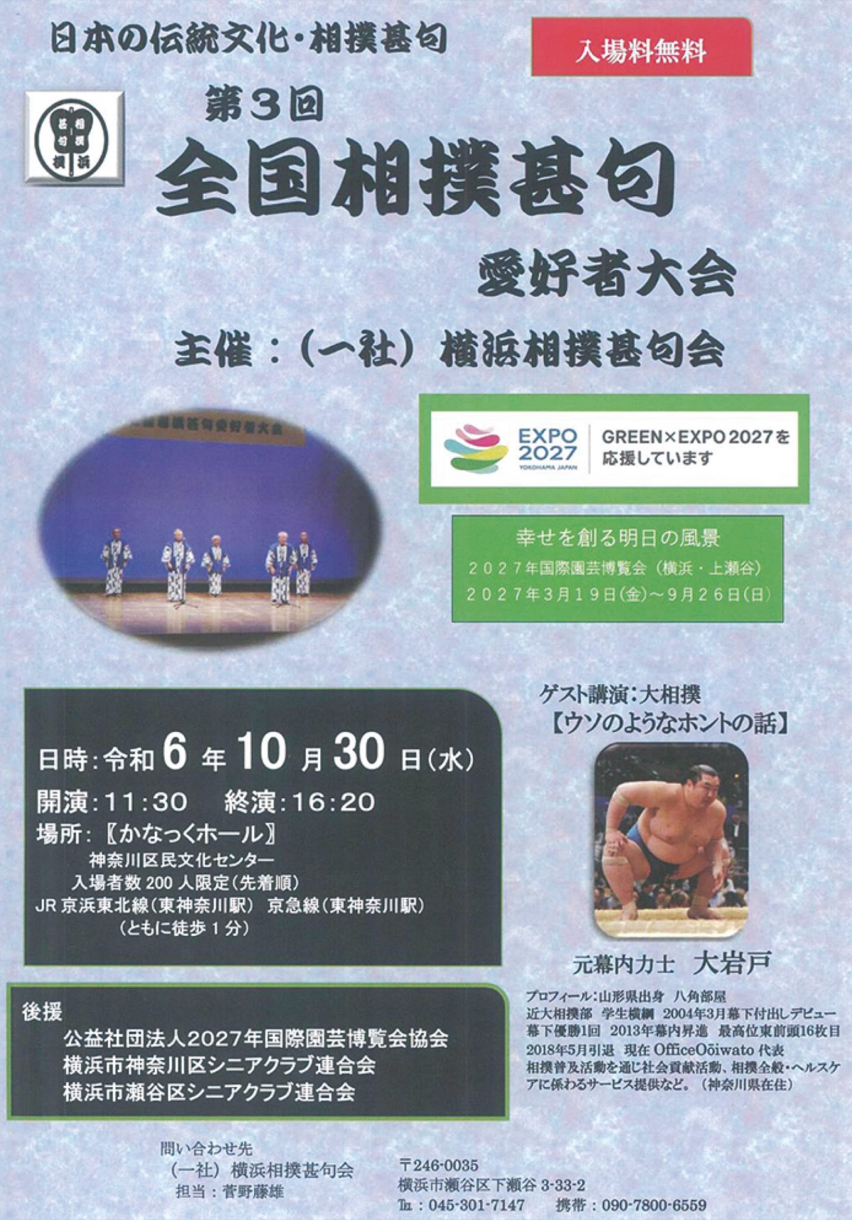 相撲甚句の愛好者が集う「第3回全国相撲甚句愛好者大会」が10月30日(水)、かなっくホールで開催される。主催は一般社団法人横浜相撲甚句会(那須健二会長)。午前11時30分開演で終演は午後4時20分。入場料は無料。定員は200人で当日先着順となる。