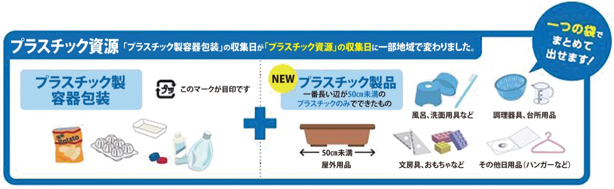 回収方法の変更により、市はこれまでのプラスチック製容器包装に加えてプラスチック製品も「プラスチック資源」として回収する。回収するプラスチック製品は、プラスチックのみでできた一番長い辺が50cm未満のもの(50cm以上は粗大ごみ)。市が進めるごみ処理の新たな計画「ヨコハマプラ5(ご)・3(み)計画」では、燃やすごみの中に含まれるプラスチックごみを2万トン削減することを目標としており、市民1人あたり5・3kgとなる。10月から先行して分別ルールが変更になったのは旭、泉、磯子、金沢、港南、栄、瀬谷、戸塚、中の9区。それ以外の区は2025年4月に実施される。