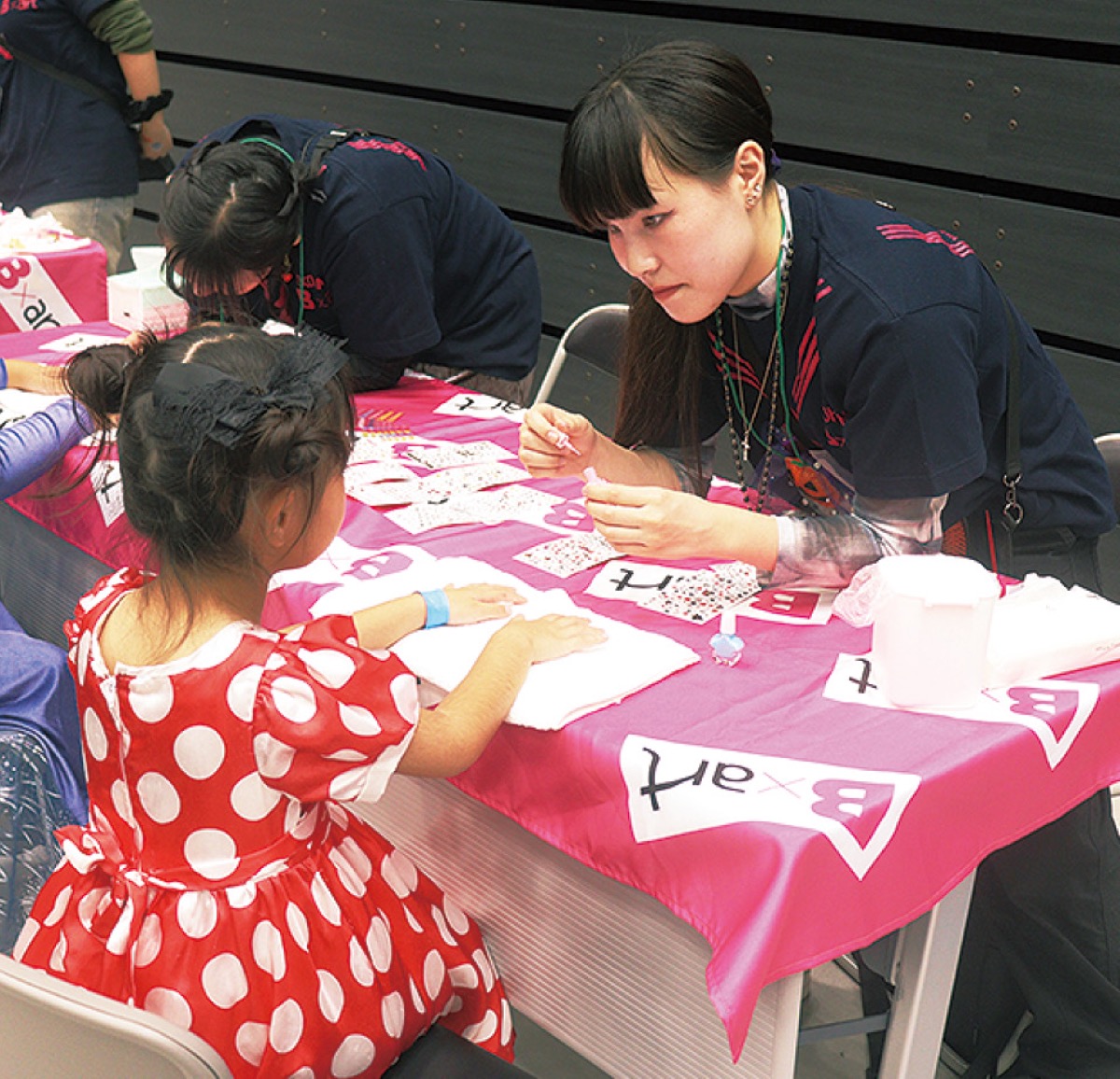 ネイルやフェイスペイント、ヘアアレンジのコーナーを担当したのは、学校法人三幸学園横浜ビューティー&ブライダル専門学校=西神奈川=の学生たち。参加したヘアメイク科1年の松岡夢さんは、「みんなとても可愛いし、完成して喜んでくれたのが嬉しい」と話し、「将来、メイクや美容にも興味を持ってくれたら」と振り返った。当日はほかにも、同学園横浜こども専門学校=二ツ谷町=の学生も出展ブースのボランティアとして参加した。