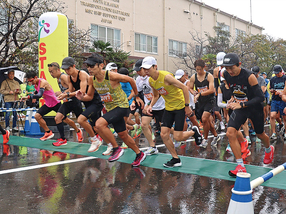 日米友好の架け橋として2015年に始まった同大会。当日はあいにくの雨模様となったが、エントリー時間には東神奈川駅からノースドックにかけて長蛇の列ができるなど、男女5キロ・10キロ・ハーフの計6部門に総勢約4000人が参加した。広大な敷地を生かした名物のストレートなどを、自己ベストを目指した真剣な表情や笑顔で疾走。停泊中の船やいつもと違った角度からのみなとみらいの景色を見ながら、米軍基地ならではの体験を楽しんだ。