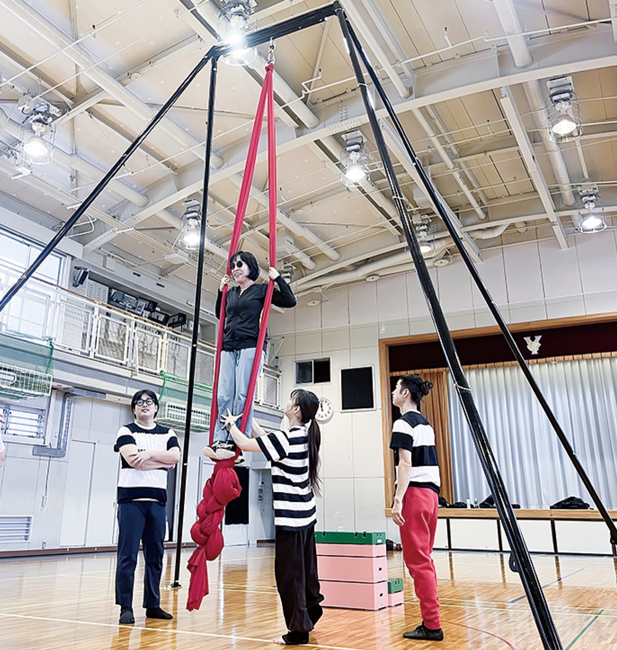指導を担当したのは、認定NPO法人スローレーベルのメンバー。スローレーベルは、同事業団が運営する障害者スポーツ文化センターラポール上大岡などで、障害の有無に関わらず誰もが楽しめるサーカスの公演や体験教室を行っている。エアリアルは、4本の支柱で約2mほどの高さから吊るされたティシューと呼ばれる布にぶら下がり、旋回や回転などの技を行うもの。