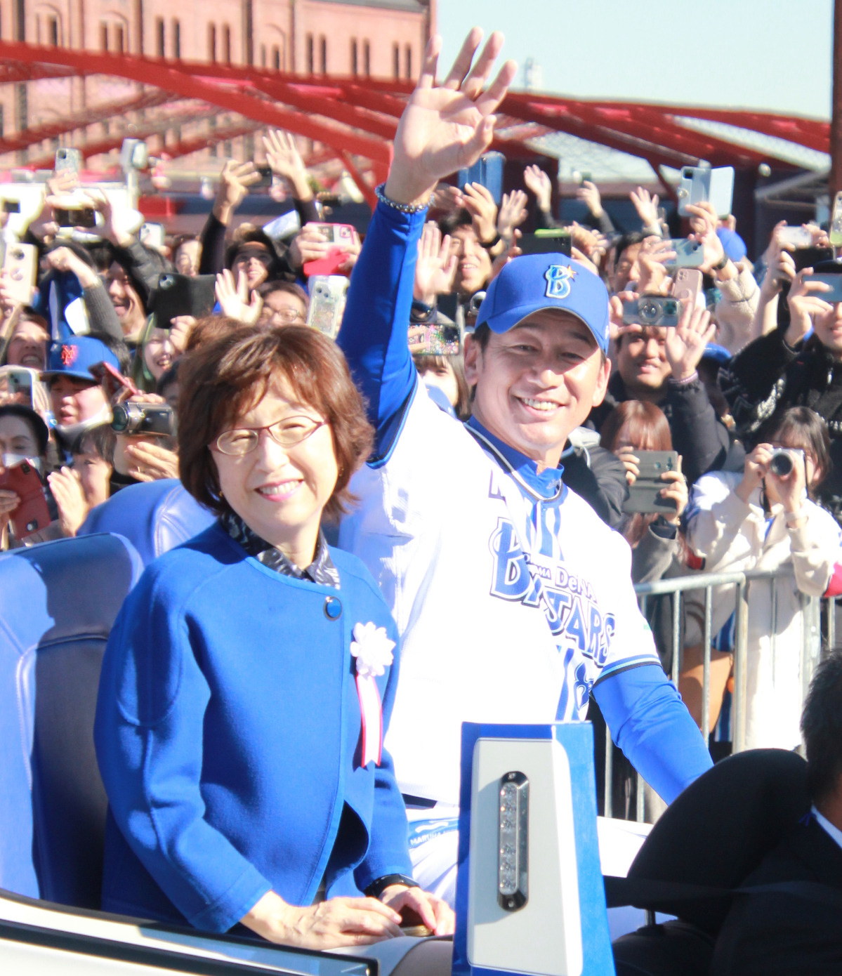 オープンカーには三浦監督や南場智子オーナー、牧秀悟選手、青葉区出身の大貫晋一投手らが乗り込み、三浦監督は時折、席から立ち上がって手を振っていた。