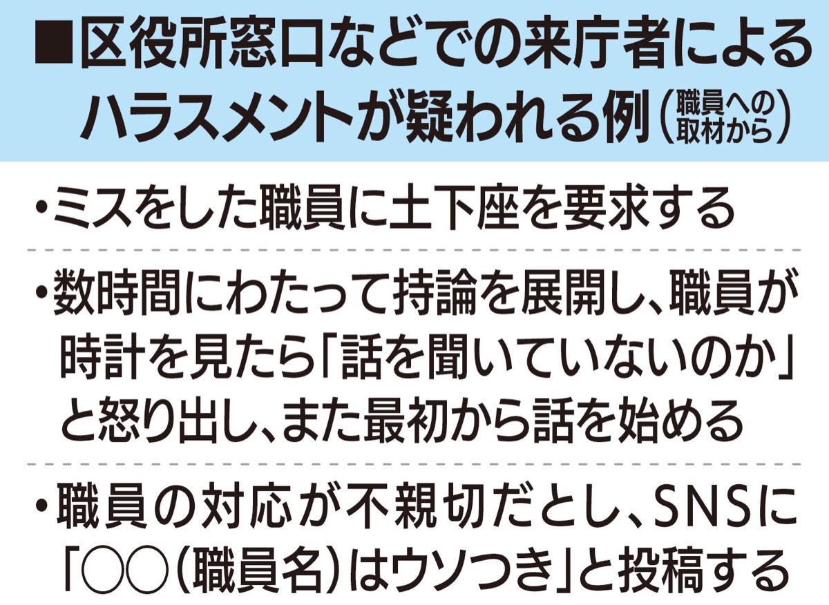 区役所窓口でのカスハラについて、市市民局は「カスハラの定義が明確ではないため、件数は把握していない」とするが、来庁者対応が多い戸籍課や保険年金課などの窓口で迷惑行為が起きやすいという。来庁者が過度に謝罪を求めたり、職員や家族へ危害を加えることをほのめかすことがあるという。SNSに職員の名前や広報物に使われていた顔写真が投稿される例も見られる。