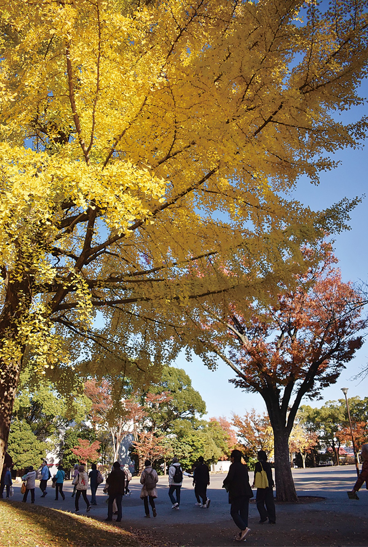 11月29日の昼間に同所を訪れると、公園中央のイチョウの葉はすっかり黄色に。秋晴れの空のもと赤・黄・緑と色とりどりの風景が広がる園内では、楽器を演奏する人やウォーキングする人などが滞在していた。