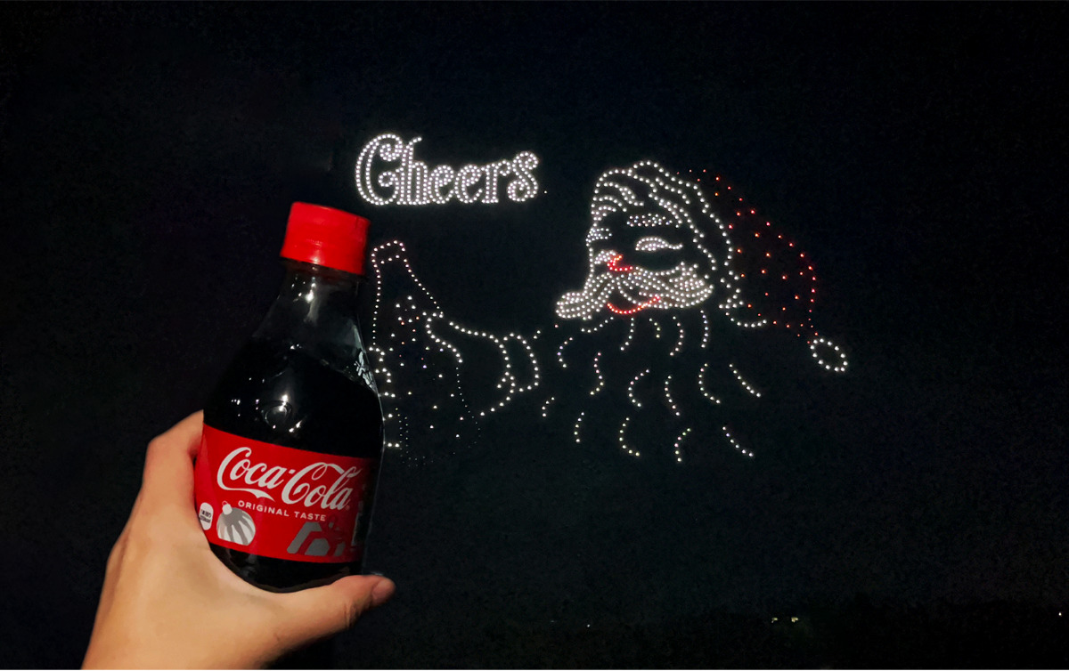 国内トップクラスの規模となる1,225機のドローンが横浜港の夜空を舞う。サンタクロースやクリスマスツリーなどが夜空に浮かび上がるほか、夜空に現れるサンタクロースとコカ・コーラで乾杯できる仕掛けも用意されている。