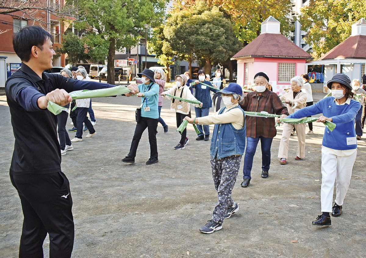 反町公園で行われた前半は、簡単なストレッチやウォーキングを実施。メガロスのスタッフから「かかとから歩いて正面を見て胸を張りましょう」などアドバイスを受けながら汗を流した。また、区役所作成の「かめ亀手ぬぐい」を使い、手ぬぐいを持って体を左右に動かしながらウォーキングするなどした。