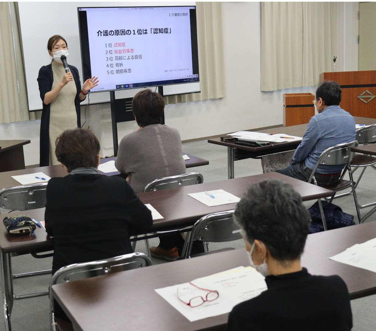 同名の著書もある介護者メンタルケア協会の代表で、公認心理師の橋中今日子さんが講師を務めた。認知症の祖母、重度身体障害の母、知的障害の弟の3人の介護を学生時代から経験した橋中さん。介護疲れや燃えつきなど、自身の経験も交えながら、「心が軽くなる介護」のポイントを紹介した。当日は、約30人が参加し、真剣な表情で橋中さんの話に聞き入っていた。