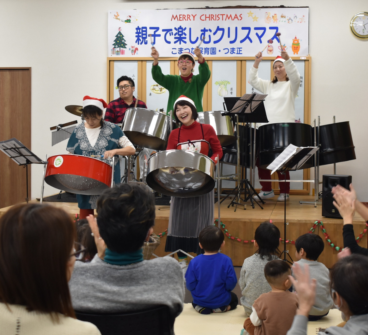 同園や近隣の保育園に通う親子など100人近くが来場。トリニダード・トバゴ共和国発祥の打楽器スティールパンによるスティールバンド「てらぱん」が『ジングルベル』などのクリスマスソングや童謡メドレーほかを演奏した。子どもたちは会場で配られた手作りのマラカスを振ったりしながら楽しんだ。