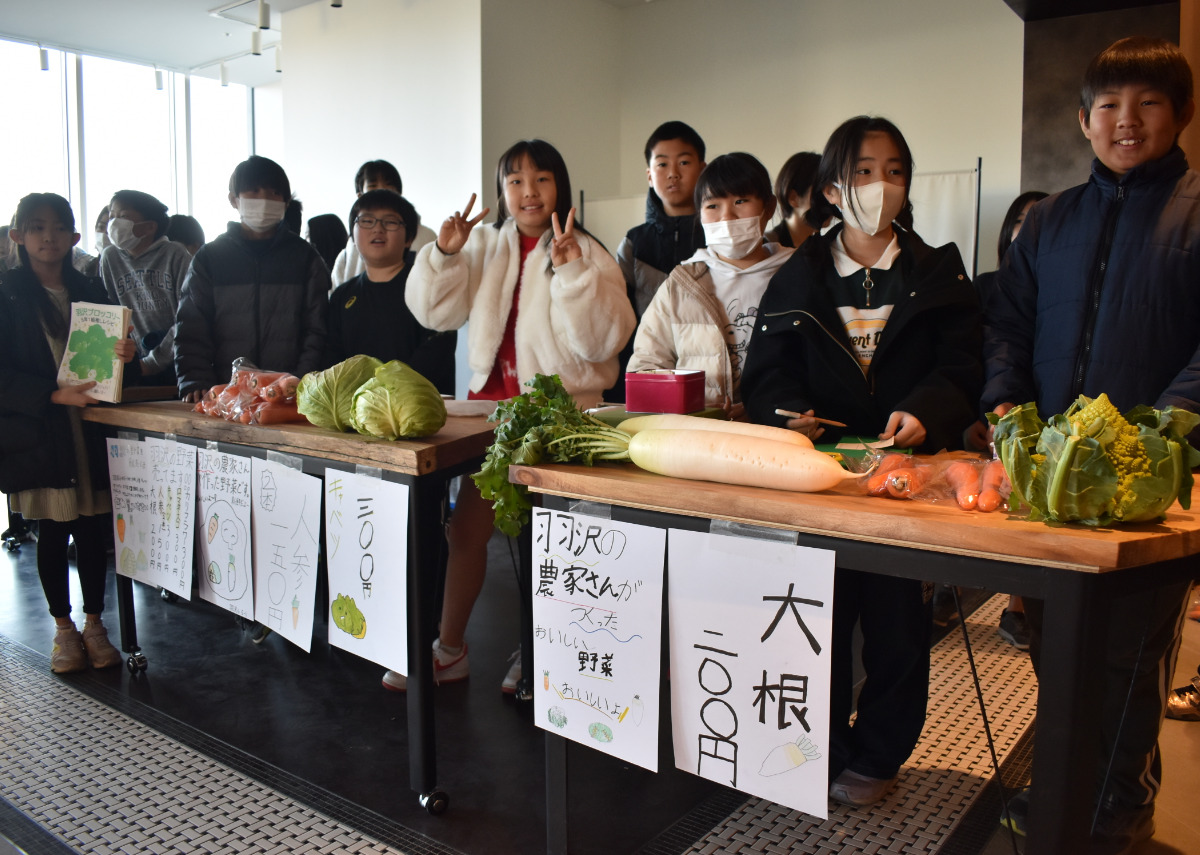 同小の5、6年生がクラスごとに地元野菜やガイドブックの販売、地域を題材にしたカルタ、写真の展示を通じて羽沢地域の隠れた魅力を発掘するもの。横浜国立大学の都市科学部建築計画研究室が協力し、同大学のサテライト施設での開催となった。