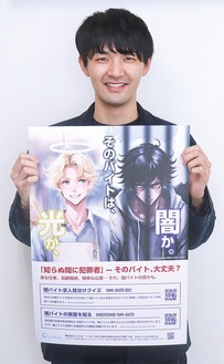 これは同社の社会貢献活動「ありがとうの日」の取組の一環。ありがとうの日は、社員が持ち回りでテーマを設定し各自が社会貢献活動を企画・立案するもの。今回闇バイトをテーマにポスターを作成したのは、江森悠人さんだ。