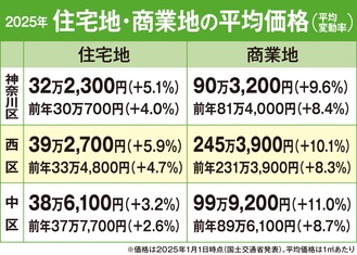 国土交通省が今年3月に公表した令和7年の公示地価によると、住宅地の平均価格は横浜市全区で上昇。神奈川区は32万2300円/平方メートル、西区39万2700円/平方メートル、中区38万6100円/平方メートルだった。