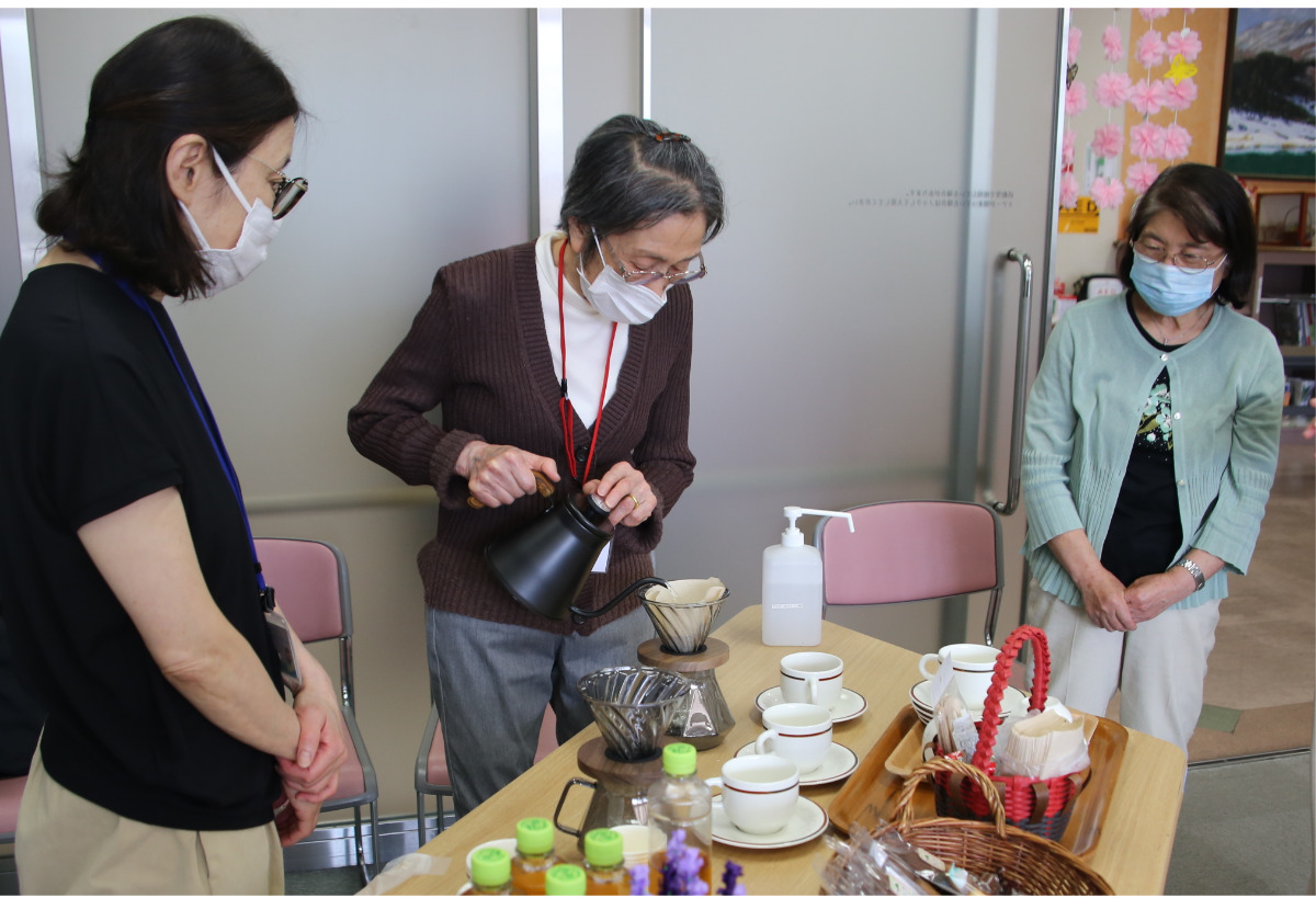 参加者をもてなしたボランティアは、ケアプラザが行ったコーヒーの入れ方講座の受講者。この日が初の実践の場となり、コーヒーを丁寧にカップへ注いでいた。