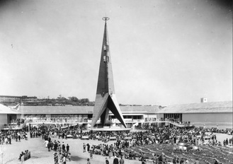 太陽の塔や大屋根リングなど、博覧会にはシンボル的存在が付き物だが、日貿博のシンボルとなったのが反町会場の「三角塔」だ。高さ30mほどとみられ、貿易の3つの要素「輸入」「生産」「輸出」の文字が各面に記された。のちに横浜スタジアムや野毛の都橋商店街ビルを設計した市内出身の建築家・吉原慎一郎が手掛けた。