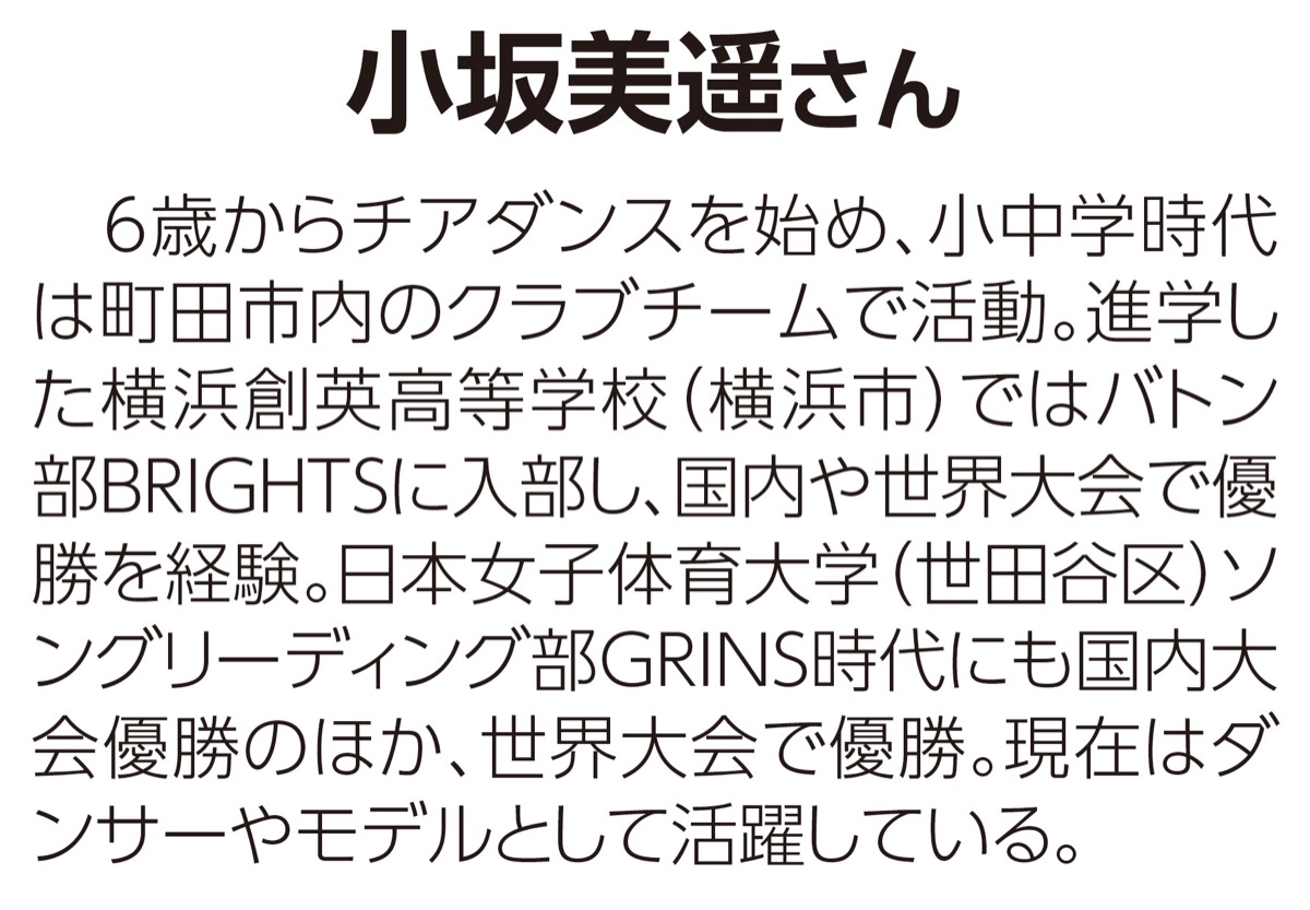 大学では強豪チームに所属し、チームをまとめる主将も務めた小坂さんは「これまでダンス一筋できた。仲間と目標に向かってがんばっていくところに惹かれている。パフォーマンスを通じ、みんなを喜ばせたいと思う」と笑顔をみせる。