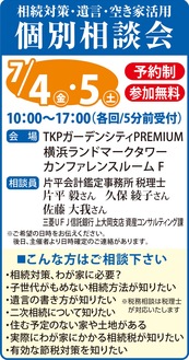 「わが家に相続税はかかる?」「節税対策は必要?」等の疑問や遺言書の書き方、保管方法、不動産の分割や節税対策、空き家の賢い活用方法など気軽に相談できるチャンス。予約制のため希望者は下記へ。