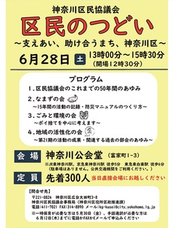 神奈川区民協議会は、市の総合計画に市民の声を反映させるために1973年に開催された「あすの横浜を話し合う区民の集い」をきっかけに、市民相互の話し合いの場として各区に誕生した「区民会議」のひとつとして74年に発足。身近な地域の諸問題を話し合う「地域のつどい」や部会活動の報告と提言発表の場として「区民のつどい」を開いてきたほか、部会による検討・実態調査などの活動を通じ、区民が自主的に区への提言活動を行ってきた。