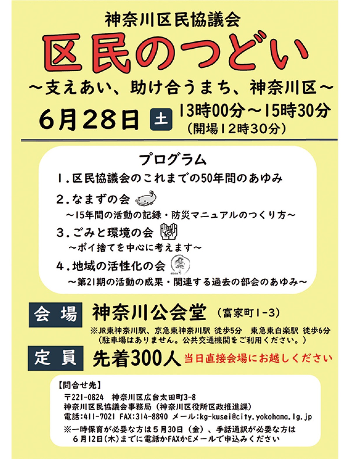 一方で、これまで活動してきたテーマ別の部会は任意団体として今後も活動を継続していくという。協議会のメンバーは「50年続いた神奈川区民協議会も今回で活動終了となります。最後の『区民のつどい』にぜひお越し下さい」としている。