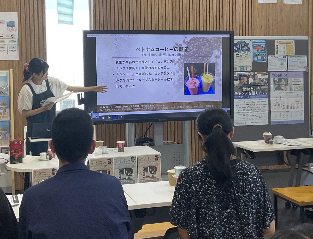 27日には横浜キャンパスでワークショップ「ベトナムコーヒーから考える珈琲産業について」が実施された。約15人の学生と地域住民がベトナムのコーヒーの歴史や、気候変動の影響で2050年までにコーヒーの適作地域が半減すると言われている「コーヒー2050年問題」などについて学んだ。その後実際にベトナムの伝統的なアルミ製フィルターを使用し、コーヒーを淹れた。