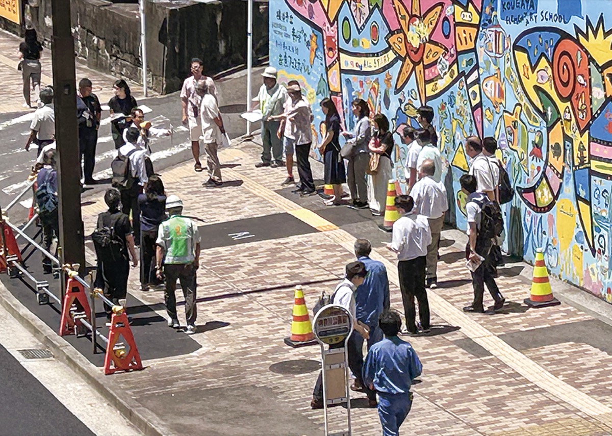 この日の協議会では、学区内の自治会町内会長やPTA役員、学校関係者からなるメンバーらが、国道事務所の案内のもと現地を視察。スロープ階段設置に伴い従来より狭くなる歩道部分や、近隣道路の安全状況を確認した。その後参加者からは、帽子などの落下防止を目的とした歩道橋上への風除けパネルの設置や、階段降り口での歩行者や自転車との接触を避ける工夫などについての要望が寄せられた。