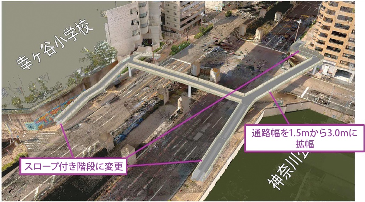 国道事務所によると、架け替えは4段階に分けて実施。まずは横浜駅寄りの既設階段を撤去し、横浜駅側にスロープ付き階段と新たな通路を架設。その後既存の通路を撤去し、神奈川公園向かいマンション付近への階段も同様にスロープ付きのものへ変更する。