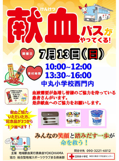 地元有志によって2022年に設立された地域献血実行委員会YOKOHAMA(代表/志賀恭子さん)による献血イベントが7月13日(日)に中丸小学校西門で開催される。午前10時から正午までと午後1時半から4時までの二部開催。協力者には記念品が用意されているほか、事前予約した人には棒ラーメンのプレゼントも。献血に関する予約・問い合わせは、【携帯電話】090・3221・6012へ。