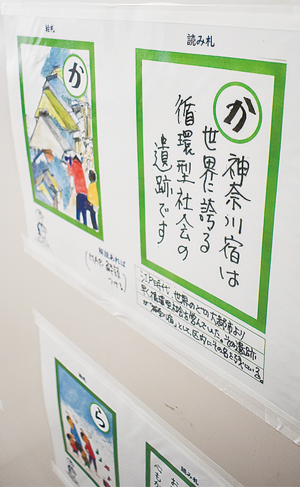 幅広い世代に環境問題を身近な課題として捉えてもらうとともに、まちへの愛着を深めてもらうために製作されたもの。読み札と絵札セットで16作品が展示され、「おいしく残さず食べきるかながわ地場野菜」や「静かなる緑の木立鳥の声菅田はみんなの理想郷」など、神奈川区らしい札が展示された。今年度は10月から講座の開設を予定しているという。