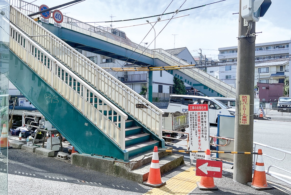 沢渡交差点と泉町交差点の間にある泉町歩道橋の撤去工事が、7月22日から始まった。管理する神奈川土木事務所によると、8月末までには橋全体の撤去を終える予定。同歩道橋は1968年に供用開始。設置から57年が経過していた。