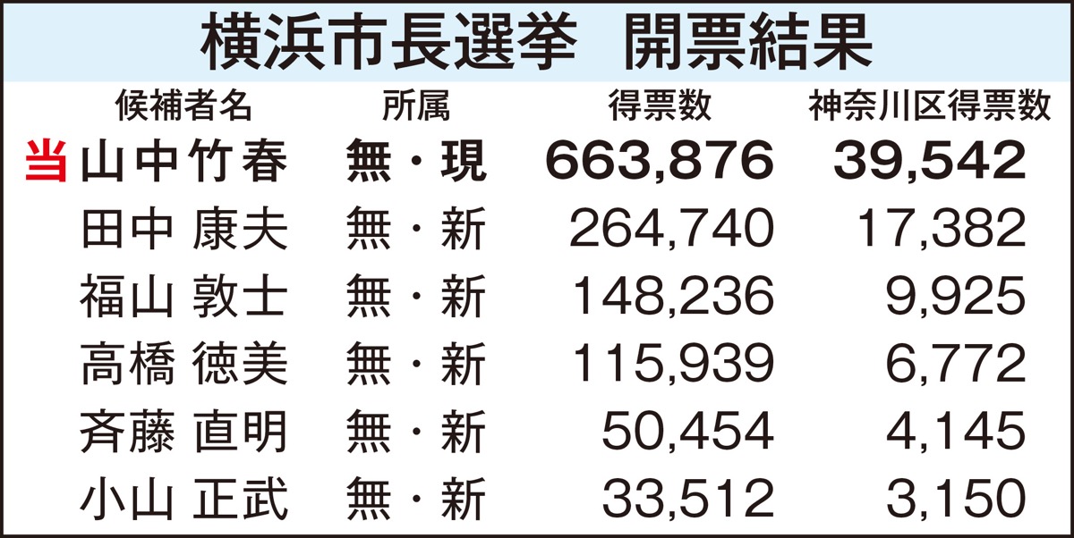 任期満了に伴い、8月3日に投開票された横浜市長選挙は現職の山中竹春氏(52)が約66万票を得て再選された。自民、公明、立民の各党が支援し、4年間の実績を強調した選挙戦を展開。幅広い支持を集めて新人5人を圧倒し、得票率は5割を超えた。投票率は41・64%で前回を7・41ポイント下回った。