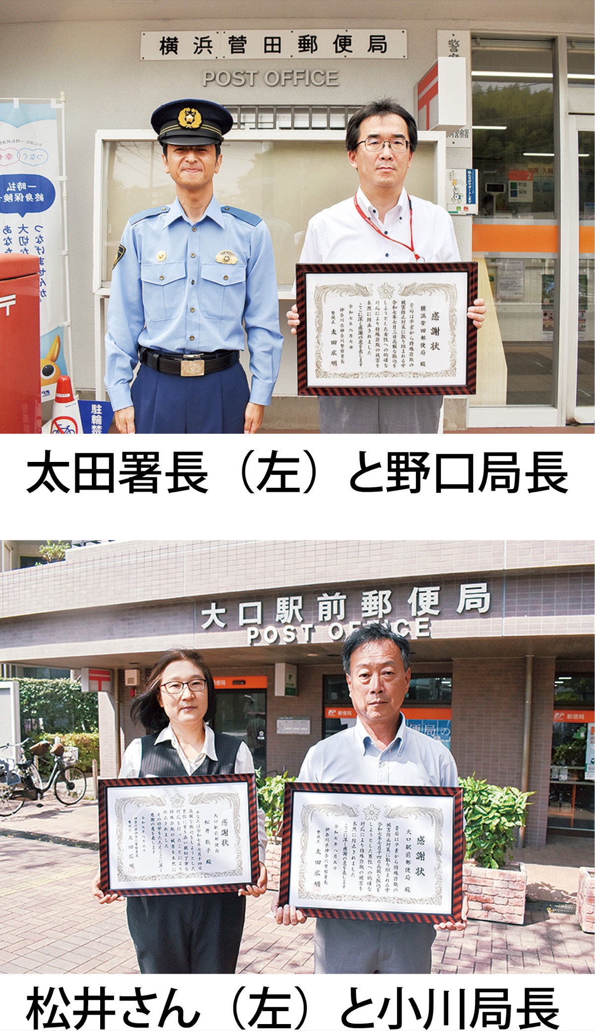 神奈川警察署(太田広明署長)は特殊詐欺被害を未然に防いだとして、大口駅前郵便局と横浜菅田郵便局に感謝状を8月上旬に贈呈した。