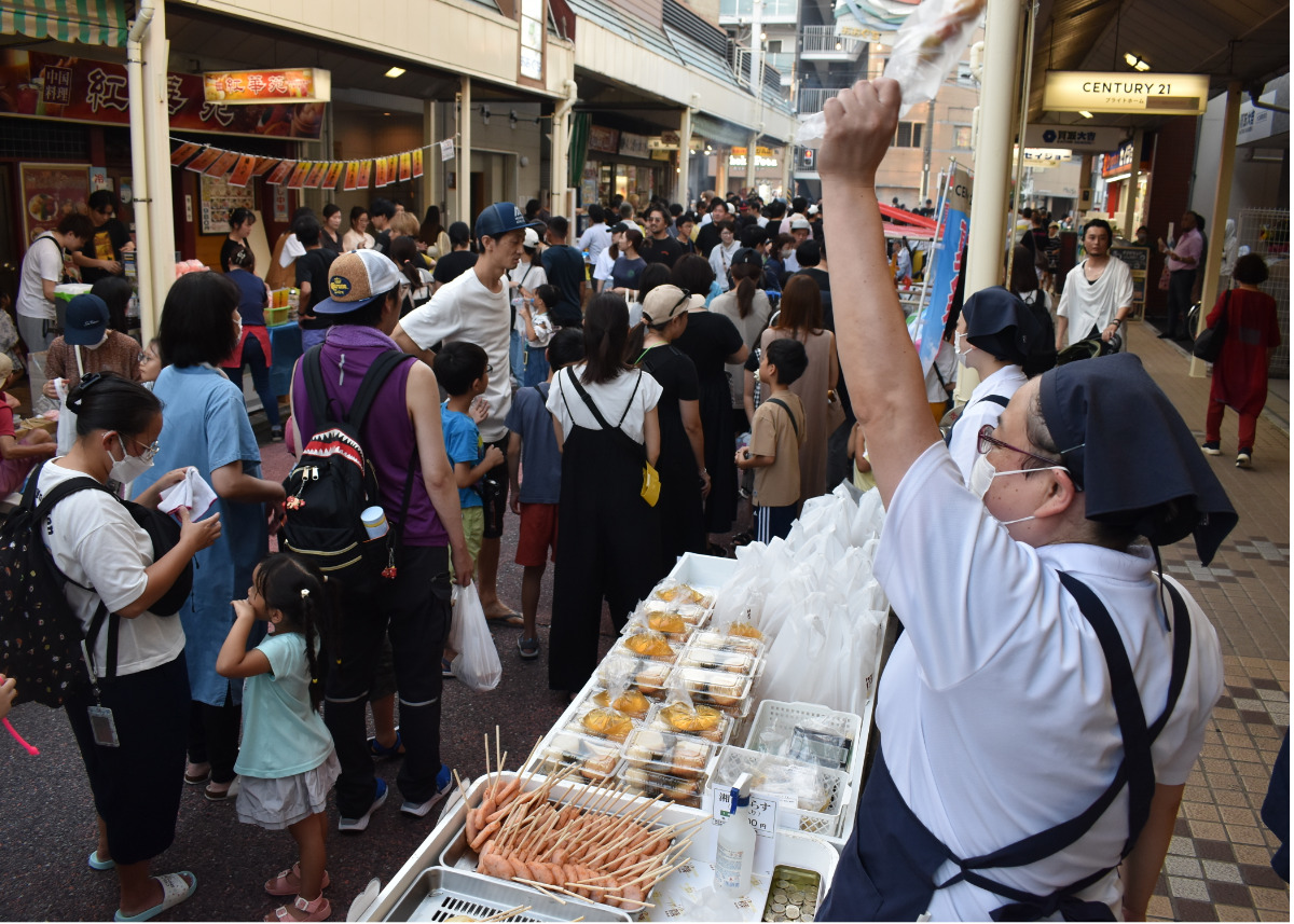 全長380mに及ぶ商店街のアーケードの下に夜店が連なり老若男女が来場する、1970年頃から続けてきた一大イベント。当日は、焼き鳥や焼きそばなどの飲食の模擬店のほか、ミニルーレットや金魚すくいといった子ども向けのゲームなど、多数の出店が軒を連ねる。