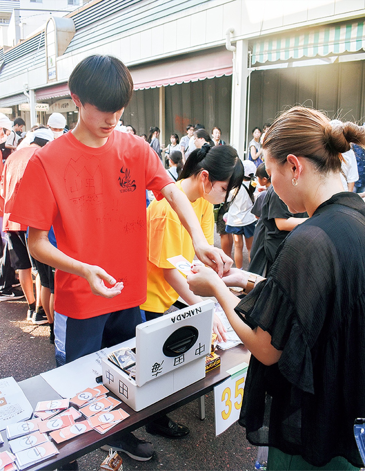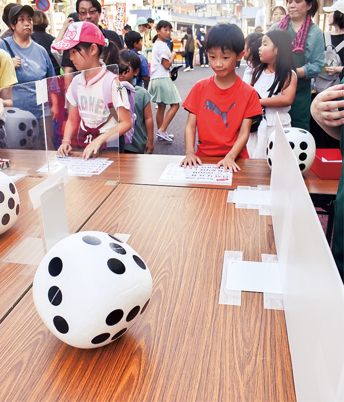 全長380mに及ぶ商店街アーケードに飲食やゲームなど多数の店が連なる催し。商店街による子ども向けのゲームコーナーは、恒例のコンピューターゲームや輪投げ、巨大サイコロなどどのブースも大にぎわい。一方で「夏休みもおしまいだね」と過ぎゆく夏を惜しむ声も会場からは聞かれた。
