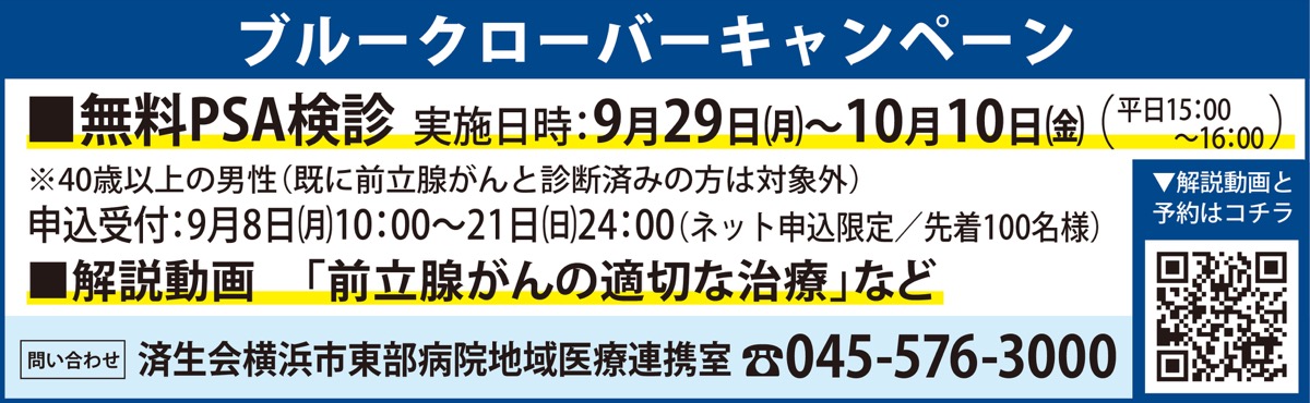 済生会横浜市東部病院=鶴見区下末吉=で9月8日(月)から10月10日(金)まで、前立腺がんの早期発見・治療を目的とする普及啓発企画「ブルークローバーキャンペーン」が行われる。9月29日(月)からは無料のPSA検診(要事前予約)もある。