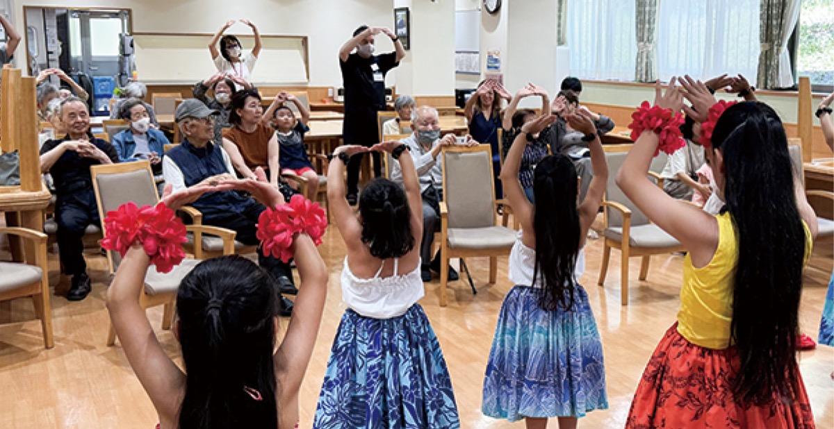 7月にはフラダンスチーム「フラレイマカマエ」の子ども10人が来館し、施設入居者たちにダンスを披露した。子どもたちは配膳の手伝いも積極的に行っており、施設入居者からの感謝の言葉に照れながらも、嬉しそうな表情を見せていた。