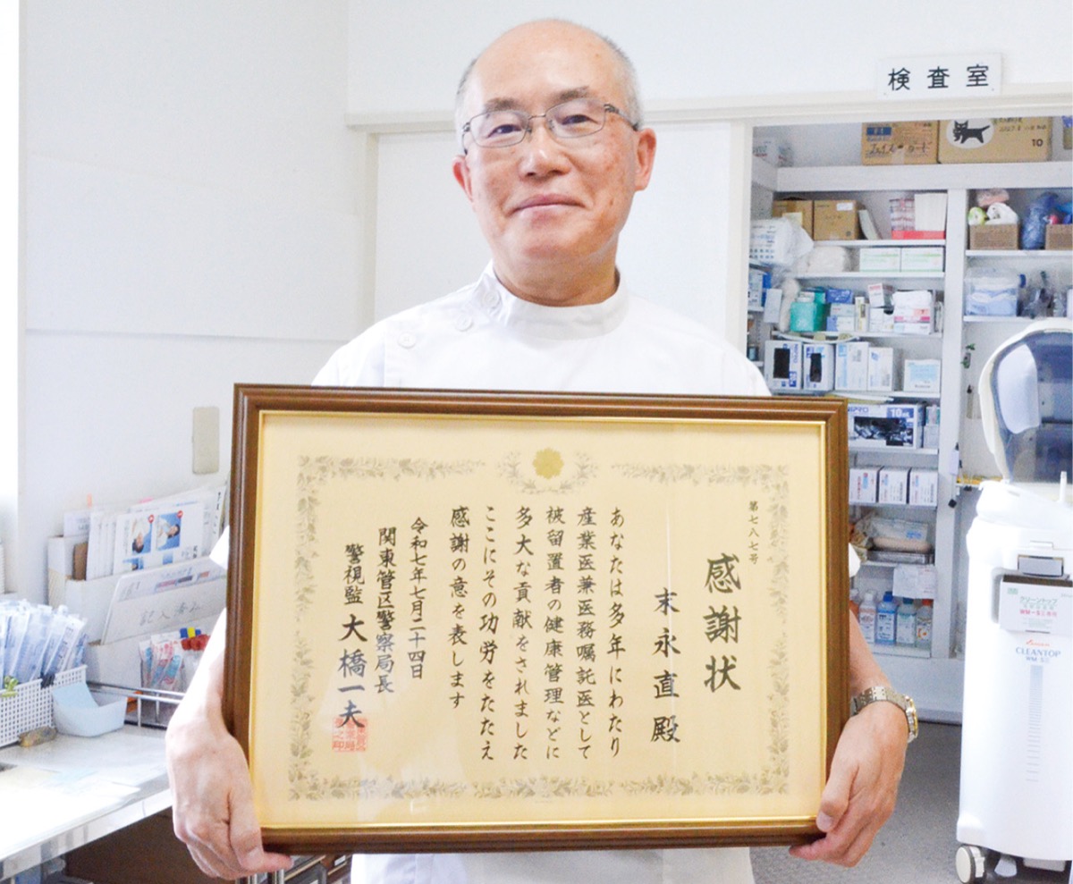 七島町にある末永クリニックの末永直院長=人物風土記で紹介=にこのほど、関東管区警察局から感謝状が贈られた。産業医兼医務嘱託医として被留置者の健康管理などに長年務めたことに対するもの。末永院長が嘱託医を務めてから今年で27年目。当時の神奈川区医師会会長から、外科医としての経験があるということで指名されたのがきっかけだという。末永院長は賞状を手に「見ていてくれた人がいたと思うと嬉しい」と話した。
