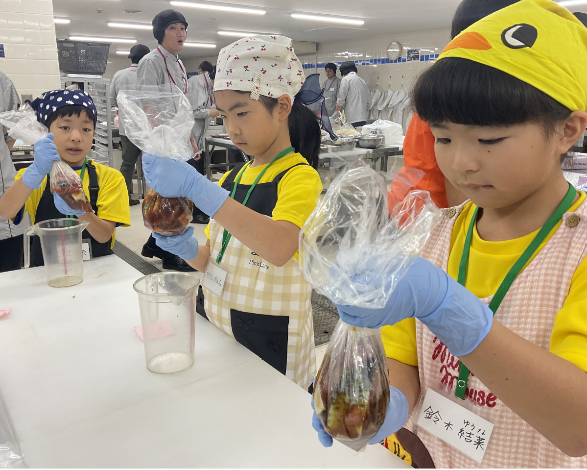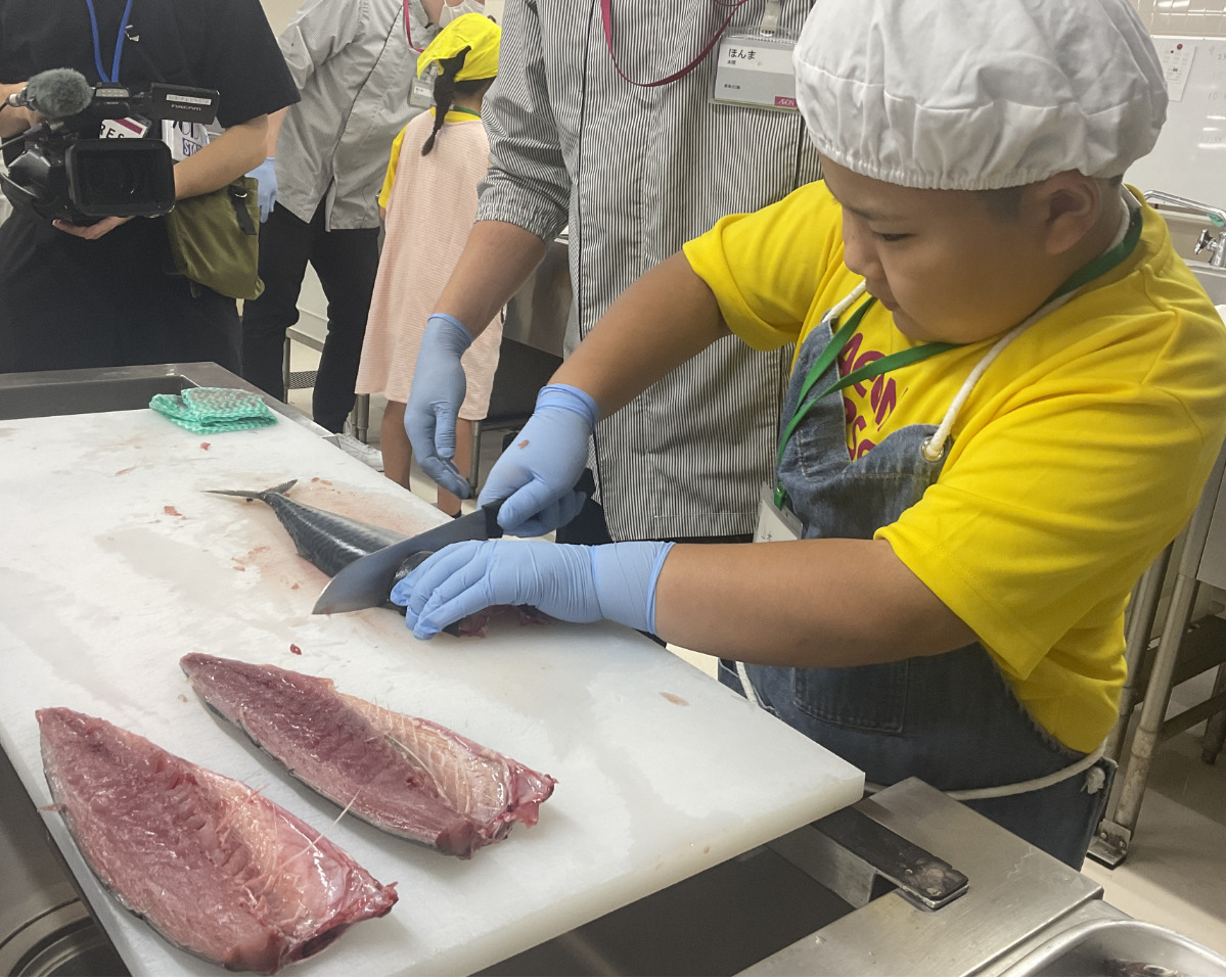 当日は親子7組が参加し、魚の資源保護に関する座学を受けた後、サバの2枚おろし、アジの3枚おろしを体験。子どもたちはフライのパン粉つけ、親たちは刺身のお造り実習などを経て、最後は自分たちがおろした魚料理を試食し、感想を述べ合った。神大寺から参加した山本紡久さん(9)はアジの3枚おろしを体験し「簡単だった。食べるのが楽しみ」と満足気に話していた。