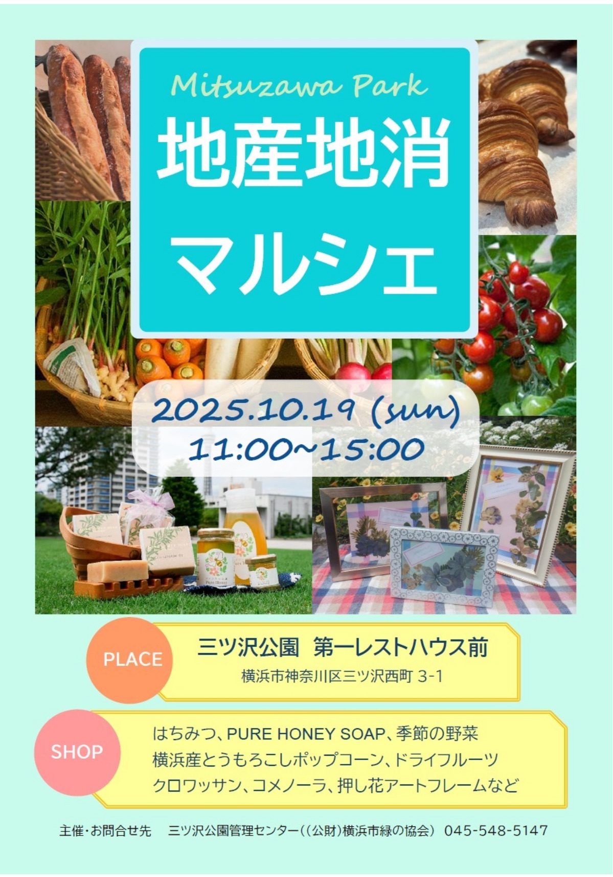 三ツ沢公園で10月19日(日)、「地産地消マルシェ」が開催される。会場は同公園の第一レストハウス前で、時間は午前11時から午後3時まで。