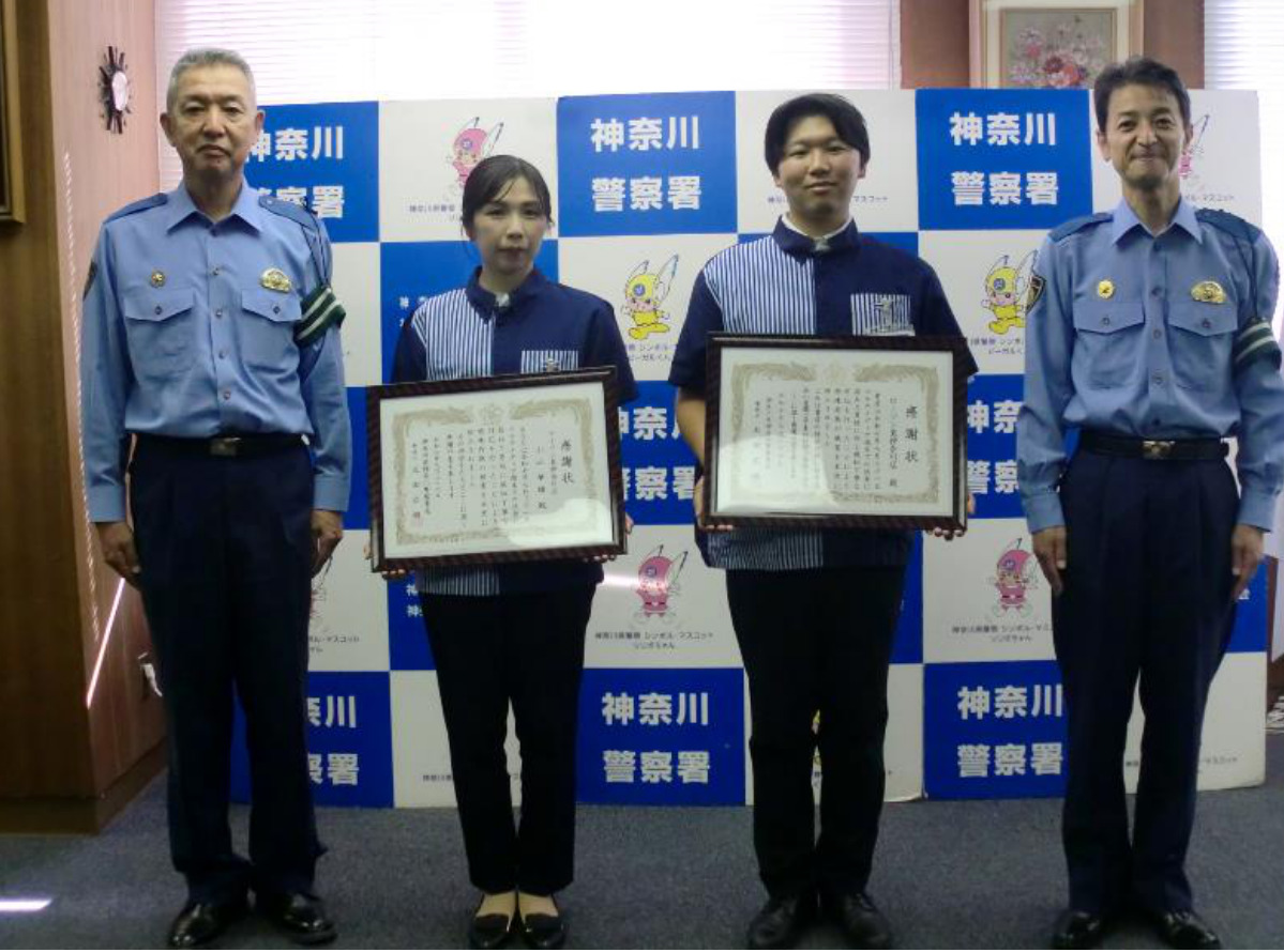 神奈川警察署は、特殊詐欺の被害を未然に防いだとして、横浜六角橋北郵便局(森輝彦局長)の局員・遠藤みさ子さんと、ローソン東神奈川店(加藤無々店長)の社員・小山華緒さんに感謝状を贈呈した。
