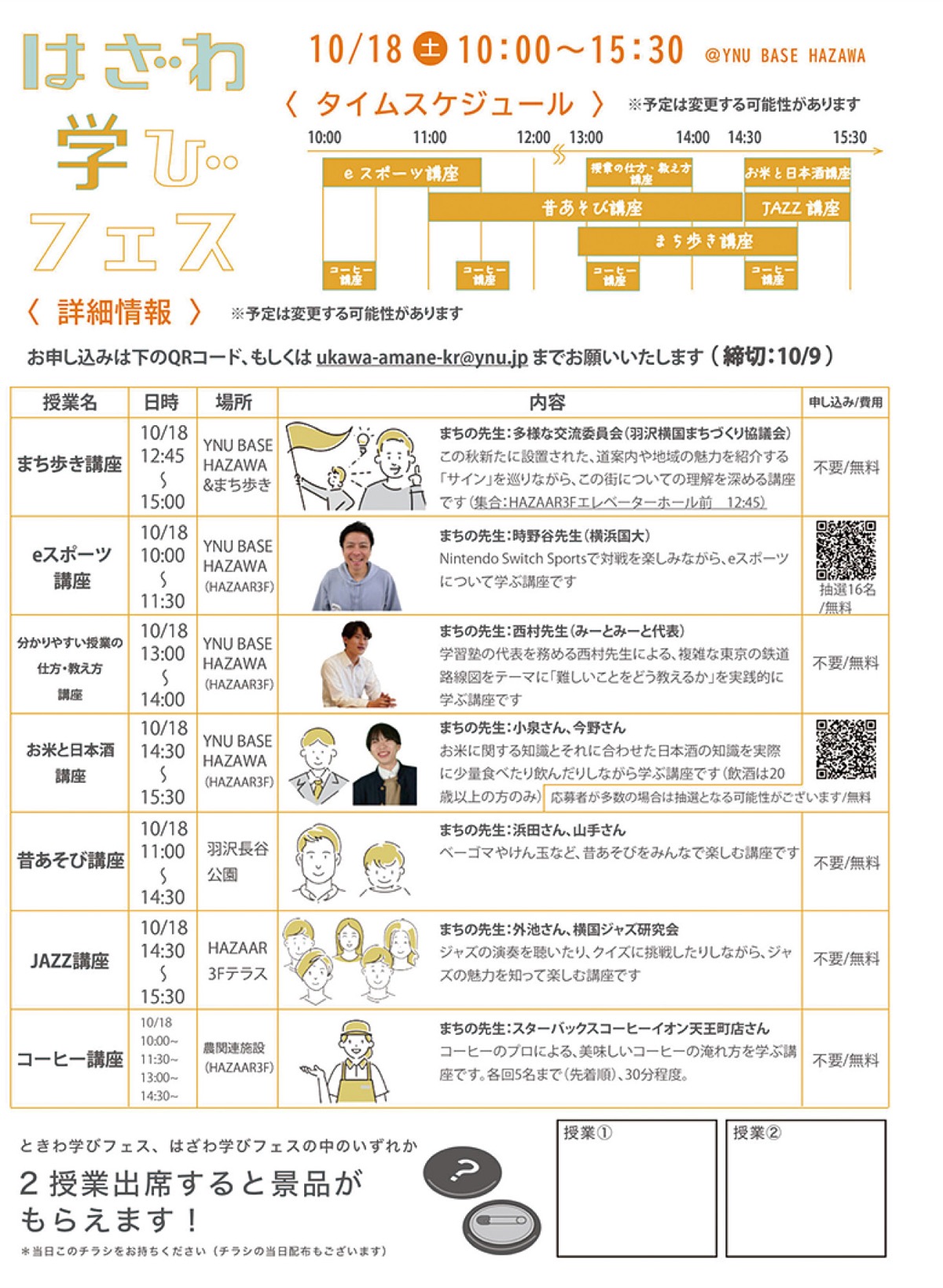 羽沢横浜国大駅近くの交流拠点「YNU BASE HAZAWA」などを会場に、10月18日(土)、「はざわ学びフェス」が開催される。主催は横浜国立大学建築計画研究室、羽沢横国まちづくり協議会国大連携委員会、常盤台地域ケアプラザ。開催時間は午前10時から午後3時30分まで。参加は無料。