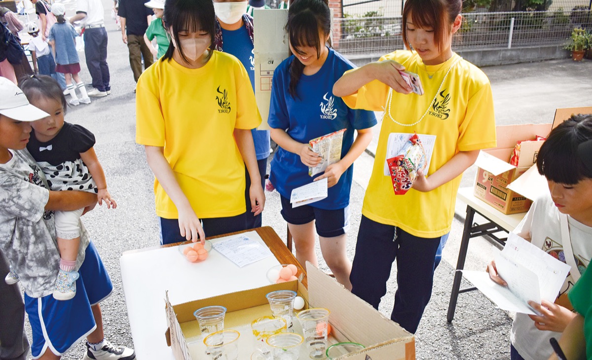 小学生が企画・運営した「ピンポン玉バウンドシュートゲーム」は、小さな子から高齢者まで楽しめるようにとルールを考案。段ボールやプラカップを使って自作し、当日はルール説明や得点計算など子どもたちが役割を決めて運営した。