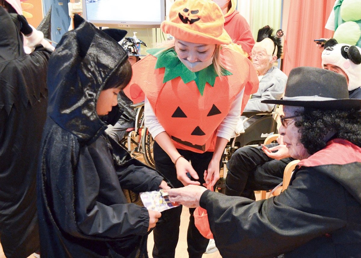 当日は雨のため、予定していた街を回るシールラリーは中止となったが、近隣の介護施設「ゆたかなビレッジ」で親子約40組が利用者13人と交流した。参加親子も利用者もほぼ全員が仮装しており、訪れた子どもたちは会場に入り利用者からお菓子をもらったあと、時間内に多くのボールを運ぶゲームを楽しんだ。