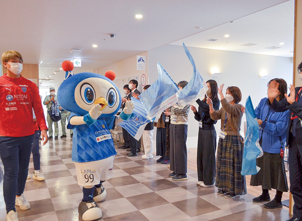 ニッパツ三ツ沢球技場をホームスタジアムとするプロサッカーチームの横浜FCは12月10日、横浜市立市民病院を訪問し、小児病棟に入院する子どもたちにプレゼントを渡した。当日は同チームの片原大示郎代表取締役社長、横浜FCの市川暉記選手、ニッパツ横浜FCシーガルズの松井里央選手、オフィシャルマスコットの「フリ丸」が来院。同院の職員と懇談した後、小児病棟を訪れ、子どもたちに同チームのグッズなどをプレゼントした。