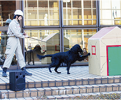 同フェアは今年で3回目。当日は市消防音楽隊による演奏や震災ドキュメンタリー映画の上映、防災情報の展示などが行われた。また、今回は災害救助犬の訓練実演と阪神・淡路大震災の被災者講演会も行われた。壇上に立った庄野ゆき子さんは地震の恐ろしさ、日頃の備えの大切さなど自らの体験を交えて訴えた。救助犬にはフラットコーテッドレトリバーのダース君(5歳)とラブラドールレトリバーのルナちゃん(2歳)が登場。ダンボール製の2つの家から人が入っている家を発見する実力を見せた。